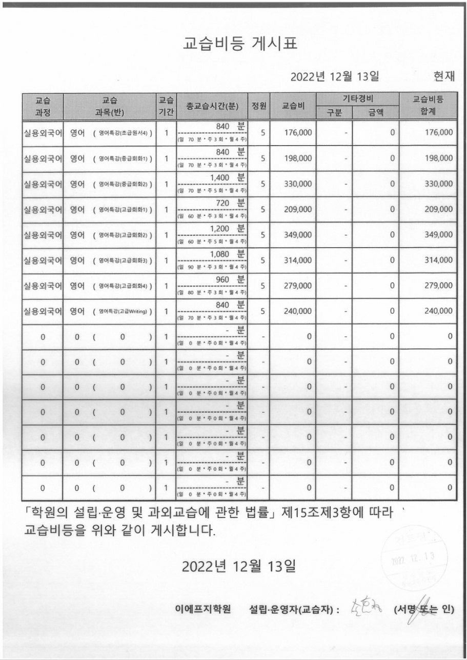 교습비등 게시표 2022년 12월 ~현재