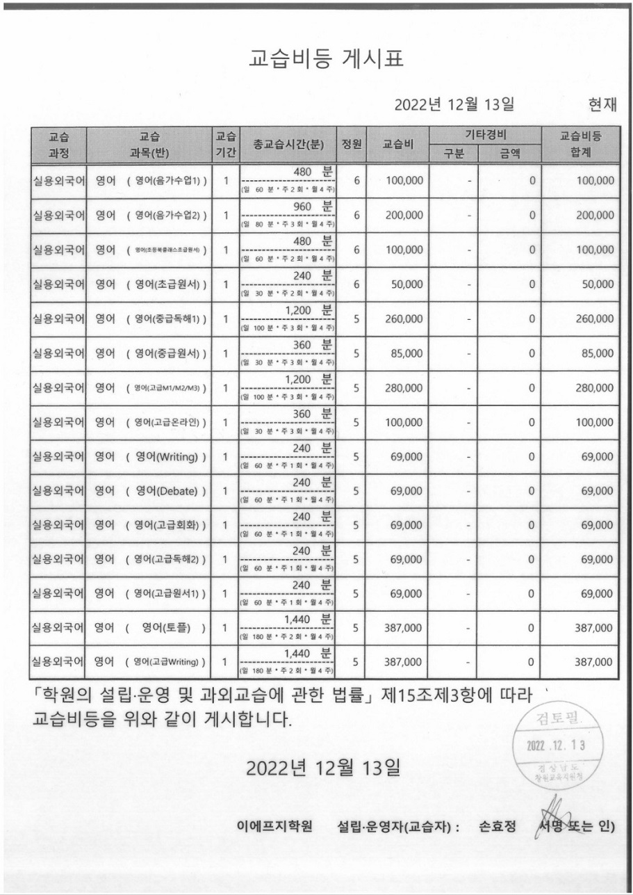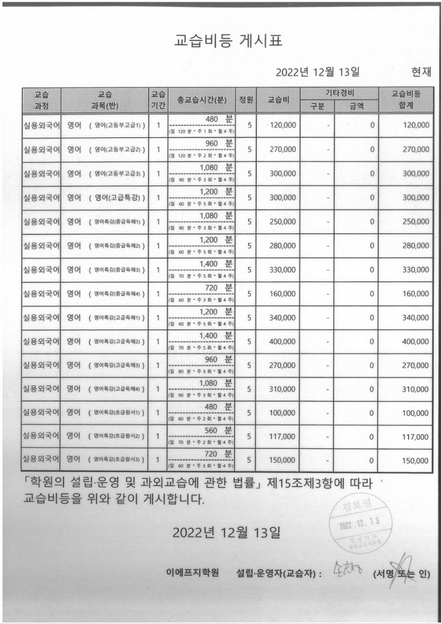 이에프지학원 교습비등 게시표